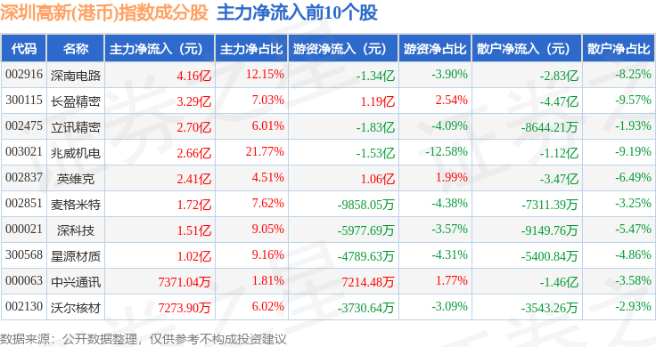 资金流向方面,深圳高新(港币)(980039)指数成份股当日主力资金净流入合计13.87亿元,游资资金净流出合计3.02亿元,散户资金净流出合计10.85亿元。成份股资金流向详情见下表: