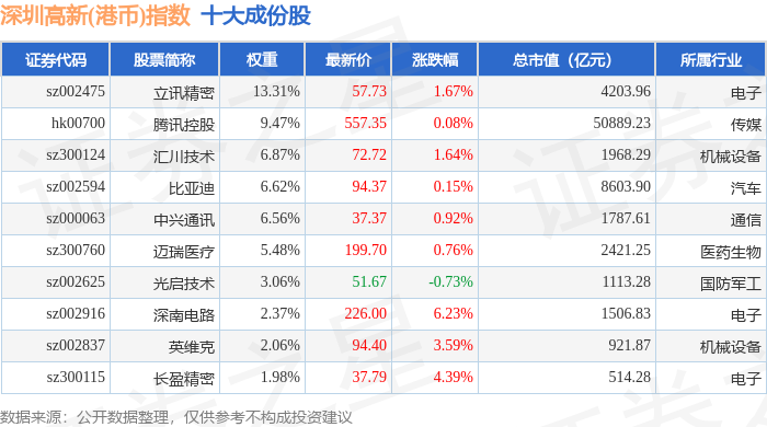 深圳高新(港币)(980039)指数十大成份股详情如下: