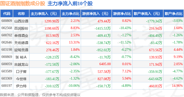 资金流向方面,国证酒指(980049)指数成份股当日主力资金净流出合计6.53亿元,游资资金净流入合计2.41亿元,散户资金净流入合计4.12亿元。成份股资金流向详情见下表:
