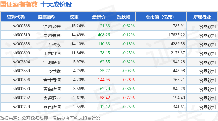 国证酒指(980049)指数十大成份股详情如下: