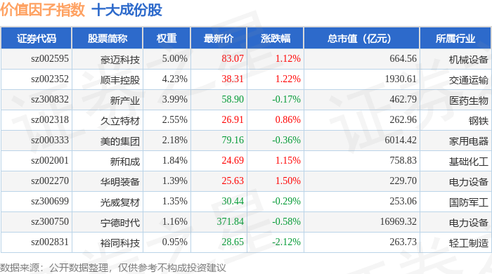 证券之星消息,12月22日,价值因子(980056)指数报收于2633.51点,涨0.7%,成交352.12亿元,换手率0.67%。当日该指数成份股中,上涨的有27家,兆威机电以10.0%的涨幅领涨,下跌的有23家,匠心家居以7.2%的跌幅领跌。