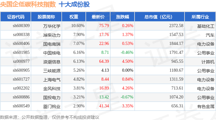 央国企低碳科技(980082)指数十大成份股详情如下: