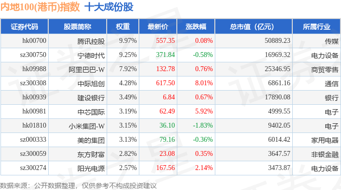 资金流向方面,内地100(港币)(983002)指数成份股当日主力资金净流入合计7.67亿元,游资资金净流出合计16.43亿元,散户资金净流入合计8.76亿元。成份股资金流向详情见下表: