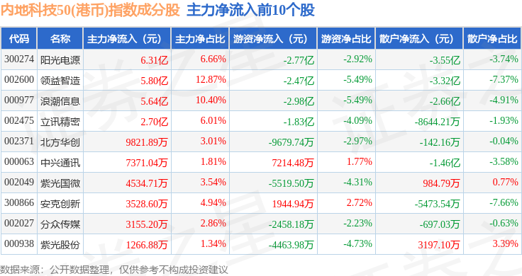 资金流向方面,内地科技50(港币)(983004)指数成份股当日主力资金净流入合计8.14亿元,游资资金净流出合计5.17亿元,散户资金净流出合计2.97亿元。成份股资金流向详情见下表: