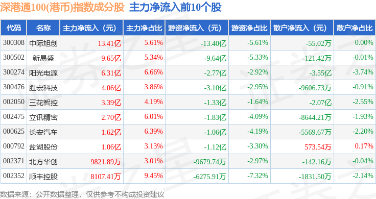 资金流向方面,深港通100(港币)(983008)指数成份股当日主力资金净流入合计10.99亿元,游资资金净流出合计22.2亿元,散户资金净流入合计11.22亿元。成份股资金流向详情见下表:
