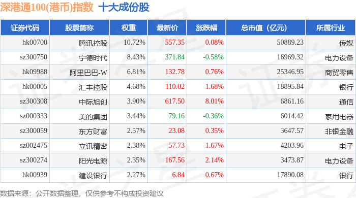 深港通100(港币)(983008)指数十大成份股详情如下:
