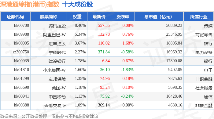 深港通综指(港币)(983006)指数十大成份股详情如下: