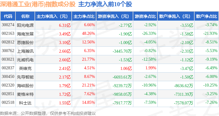 资金流向方面,深港通工业(港币)(983018)指数成份股当日主力资金净流入合计10.85亿元,游资资金净流出合计11.06亿元,散户资金净流入合计2117.45万元。成份股资金流向详情见下表: