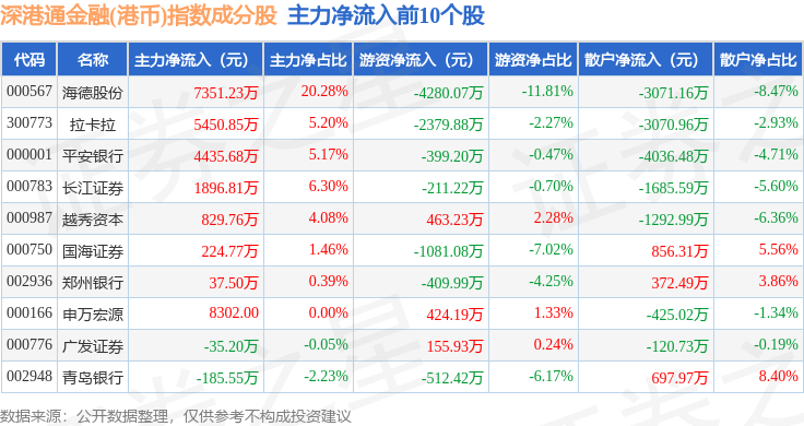资金流向方面,深港通金融(港币)(983026)指数成份股当日主力资金净流出合计3.9亿元,游资资金净流入合计2987.22万元,散户资金净流入合计3.6亿元。成份股资金流向详情见下表: