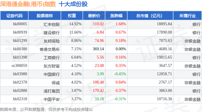 深港通金融(港币)(983026)指数十大成份股详情如下: