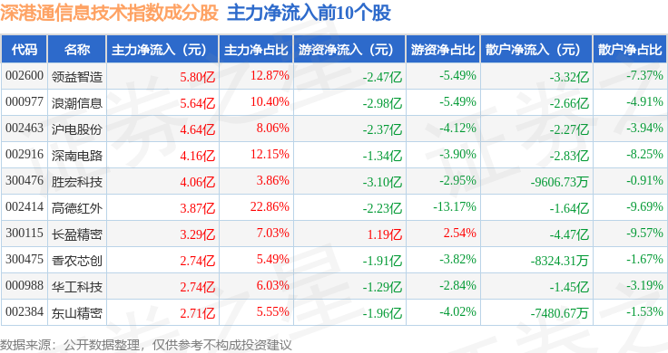资金流向方面,深港通信息技术(983027)指数成份股当日主力资金净流入合计12.34亿元,游资资金净流出合计23.53亿元,散户资金净流入合计11.19亿元。成份股资金流向详情见下表: