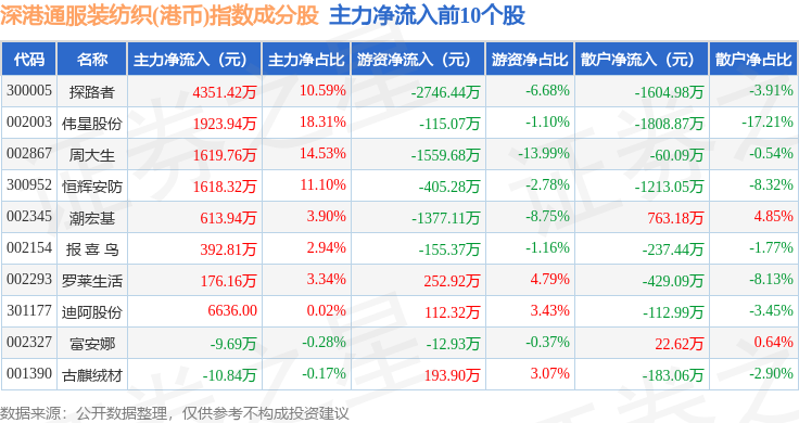 资金流向方面,深港通服装纺织(港币)(983042)指数成份股当日主力资金净流出合计1.48亿元,游资资金净流入合计1768.05万元,散户资金净流入合计1.31亿元。成份股资金流向详情见下表: