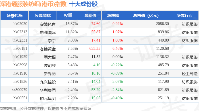 深港通服装纺织(港币)(983042)指数十大成份股详情如下: