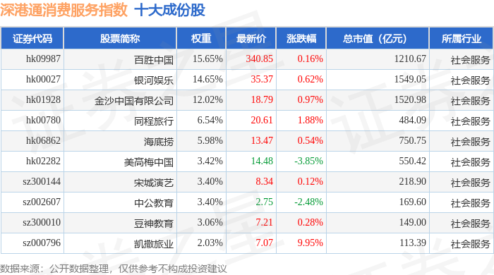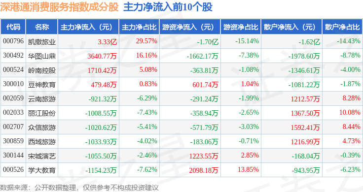 资金流向方面,深港通消费服务(983045)指数成份股当日主力资金净流入合计1.03亿元,游资资金净流出合计1.4亿元,散户资金净流入合计3644.46万元。成份股资金流向详情见下表: