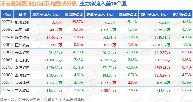 资金流向方面,深港通消费服务(港币)(983046)指数成份股当日主力资金净流入合计1.03亿元,游资资金净流出合计1.4亿元,散户资金净流入合计3644.46万元。成份股资金流向详情见下表: