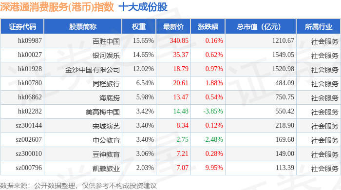 深港通消费服务(港币)(983046)指数十大成份股详情如下: