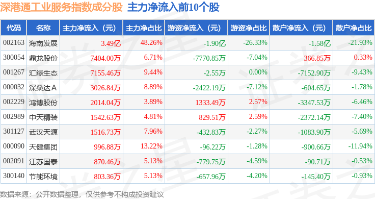 资金流向方面,深港通工业服务(983055)指数成份股当日主力资金净流出合计2539.94万元,游资资金净流出合计1.07亿元,散户资金净流入合计1.32亿元。成份股资金流向详情见下表: