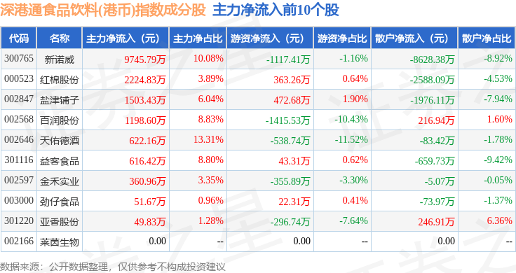 资金流向方面,深港通食品饮料(港币)(983066)指数成份股当日主力资金净流出合计5.06亿元,游资资金净流入合计1.13亿元,散户资金净流入合计3.93亿元。成份股资金流向详情见下表: