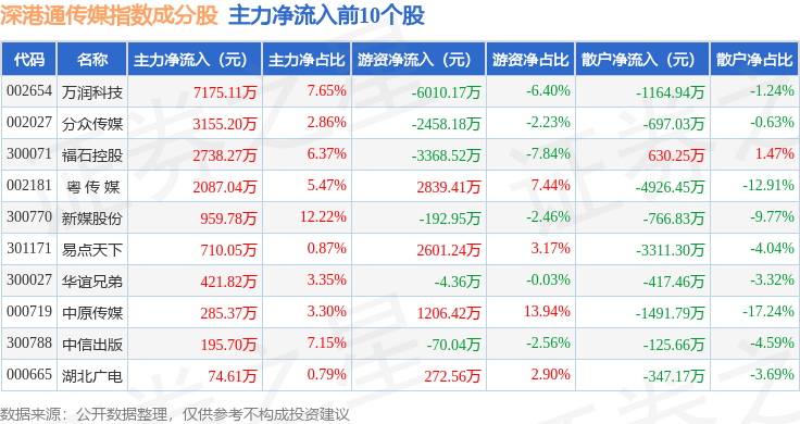 资金流向方面,深港通传媒(983075)指数成份股当日主力资金净流出合计10.33亿元,游资资金净流入合计3.72亿元,散户资金净流入合计6.61亿元。成份股资金流向详情见下表: