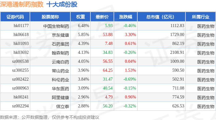 深港通制药(983079)指数十大成份股详情如下: