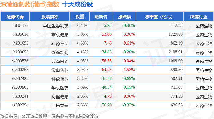 深港通制药(港币)(983080)指数十大成份股详情如下: