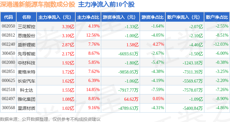 资金流向方面,深港通新能源车(983087)指数成份股当日主力资金净流入合计15.67亿元,游资资金净流出合计5.55亿元,散户资金净流出合计10.13亿元。成份股资金流向详情见下表: