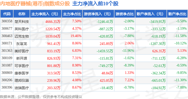 资金流向方面,内地医疗器械(港币)(983104)指数成份股当日主力资金净流出合计2.3亿元,游资资金净流入合计4434.8万元,散户资金净流入合计1.86亿元。成份股资金流向详情见下表:
