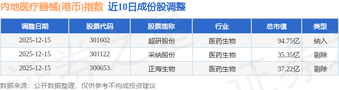 近10日内内地医疗器械(港币)(983104)指数成份股做了调整,新纳入了1只股票,剔除了2只股票。