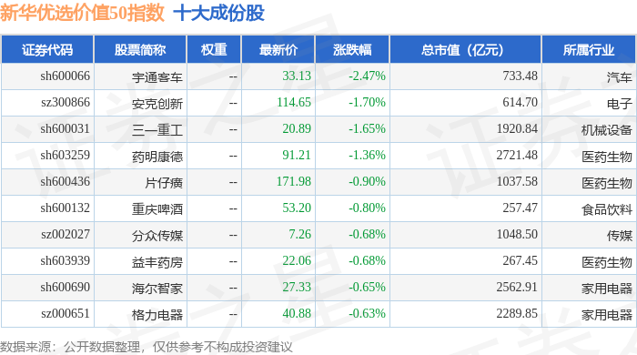 证券之星消息,12月22日,新华优选价值50(989004)指数报收于2176.84点,涨1.19%,成交1636.91亿元,换手率0.9%。当日该指数成份股中,上涨的有31家,中际旭创以8.01%的涨幅领涨,下跌的有19家,宇通客车以2.47%的跌幅领跌。