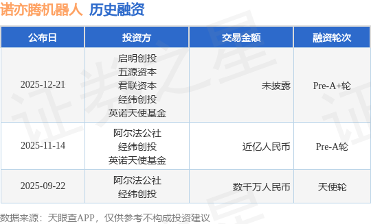 证券之星消息,根据天眼查APP于12月21日公布的信息整理,诺亦腾机器人科技(北京)有限公司Pre-A+轮融资,融资额未披露,参与投资的机构包括启明创投,五源资本,君联资本,经纬创投,英诺天使基金。