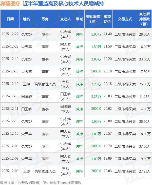 奥精医疗近半年内的董监高及核心技术人员增减持详情如下: