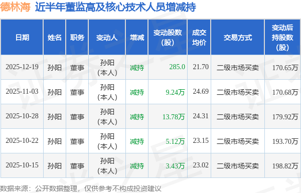 德林海近半年内的董监高及核心技术人员增减持详情如下:
