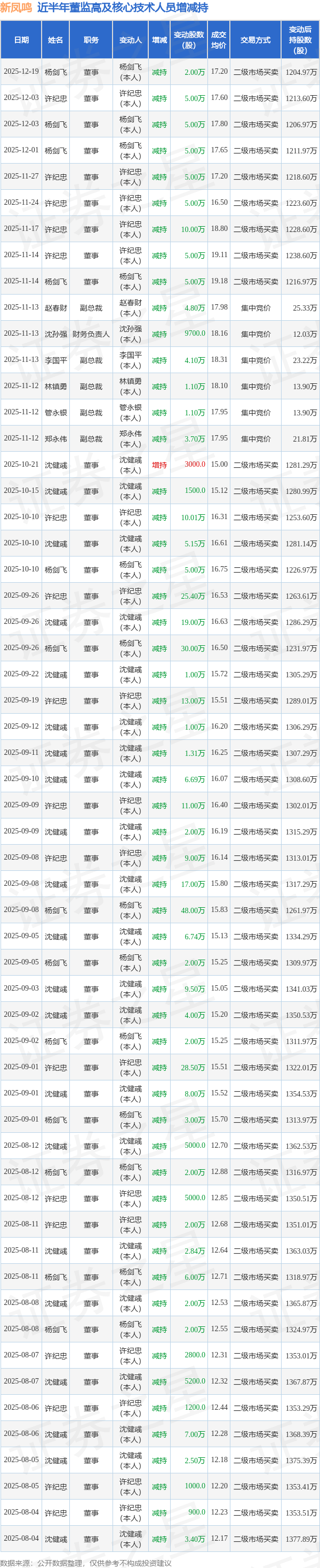 新凤鸣近半年内的董监高及核心技术人员增减持详情如下: