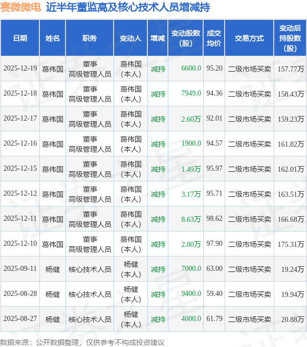 赛微微电近半年内的董监高及核心技术人员增减持详情如下: