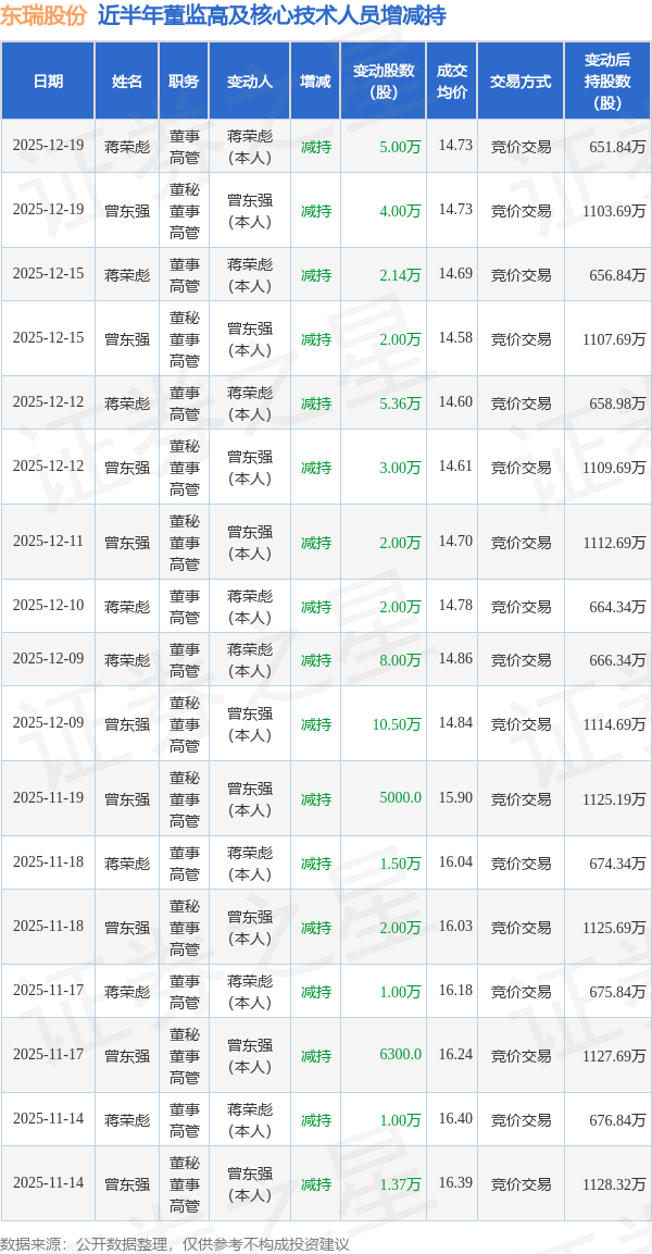 东瑞股份近半年内的董监高及核心技术人员增减持详情如下: