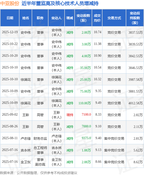 中亚股份近半年内的董监高及核心技术人员增减持详情如下: