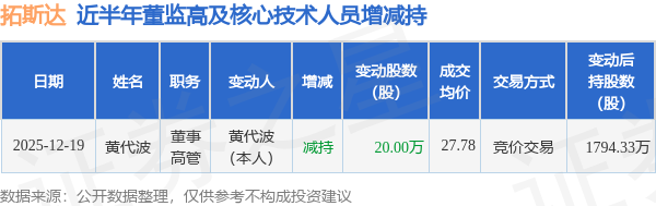 证券之星消息,根据12月22日市场公开信息、上市公司公告及交易所披露数据整理,拓斯达(300607)最新董监高及相关人员股份变动情况:2025年12月19日公司董事,高管黄代波共减持公司股份20.0万股,占公司总股本为0.0419%。变动期间公司股价上涨1.06%,12月19日当日收盘报27.75元。