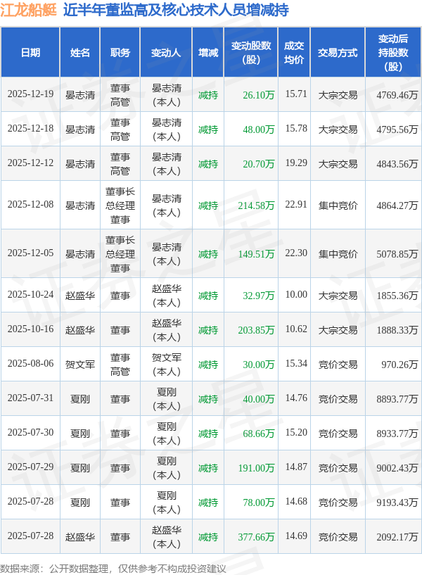 江龙船艇近半年内的董监高及核心技术人员增减持详情如下: