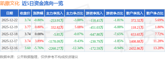 证券之星消息,截至2025年12月22日收盘,凯撒文化(002425)报收于3.74元,下跌0.8%,换手率1.83%,成交量17.45万手,成交额6547.14万元。