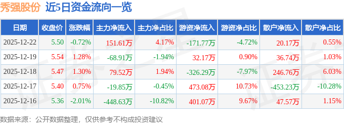 证券之星消息,截至2025年12月22日收盘,秀强股份(300160)报收于5.5元,下跌0.72%,换手率0.86%,成交量6.58万手,成交额3635.91万元。