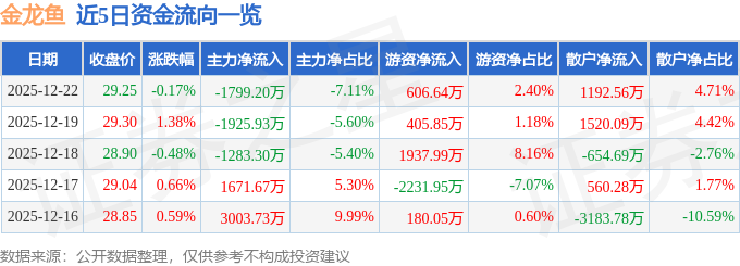 证券之星消息,截至2025年12月22日收盘,金龙鱼(300999)报收于29.25元,下跌0.17%,换手率1.59%,成交量8.65万手,成交额2.53亿元。