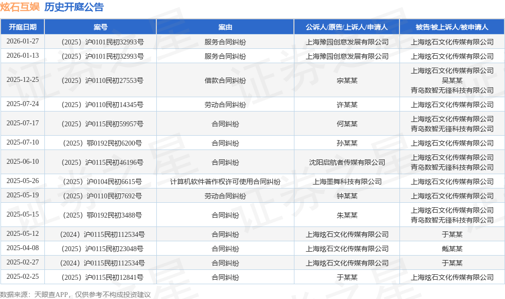 案号:(2025)沪0110民初27553号根据统计,近一年内以上海炫石文化传媒有限公司为当事人的历史开庭公告有14则,其中案由为“合同纠纷”的公告以8则居首,其次为“劳动合同纠纷”有2则,“服务合同纠纷”有2则。历史开庭公告如下: