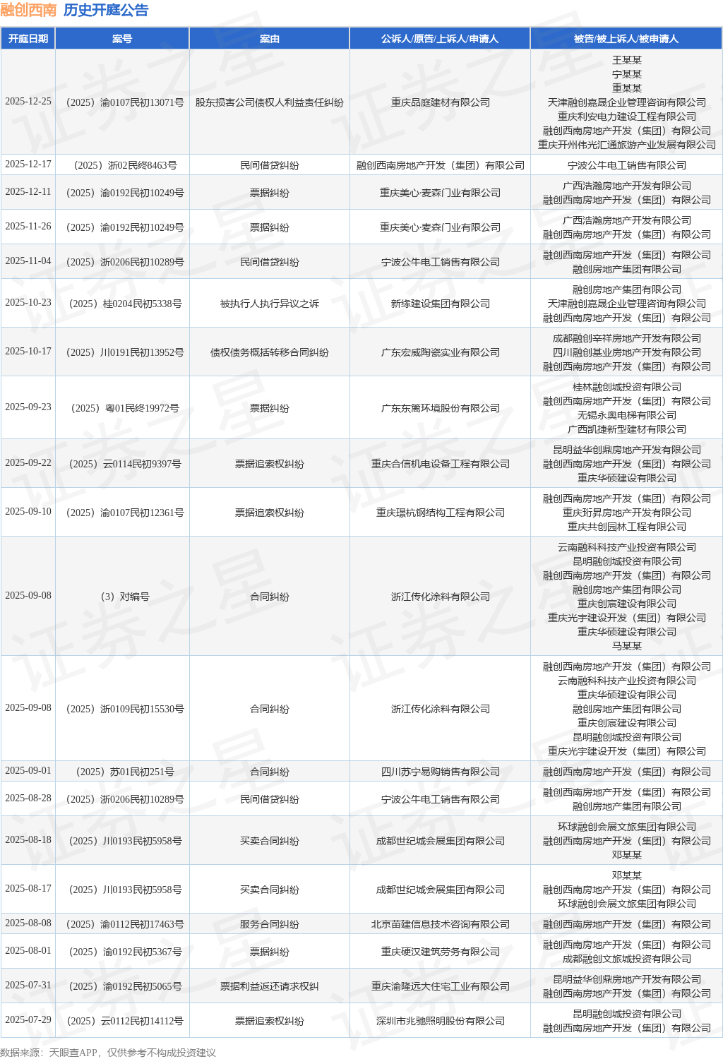 案号:(2025)渝0107民初13071号根据统计,近一年内以融创西南房地产开发(集团)有限公司为当事人的历史开庭公告有270则,其中案由为“商品房预售合同纠纷”的公告以135则居首,其次为“票据纠纷”有38则,“票据追索权纠纷”有35则。历史开庭公告(前20条)如下: