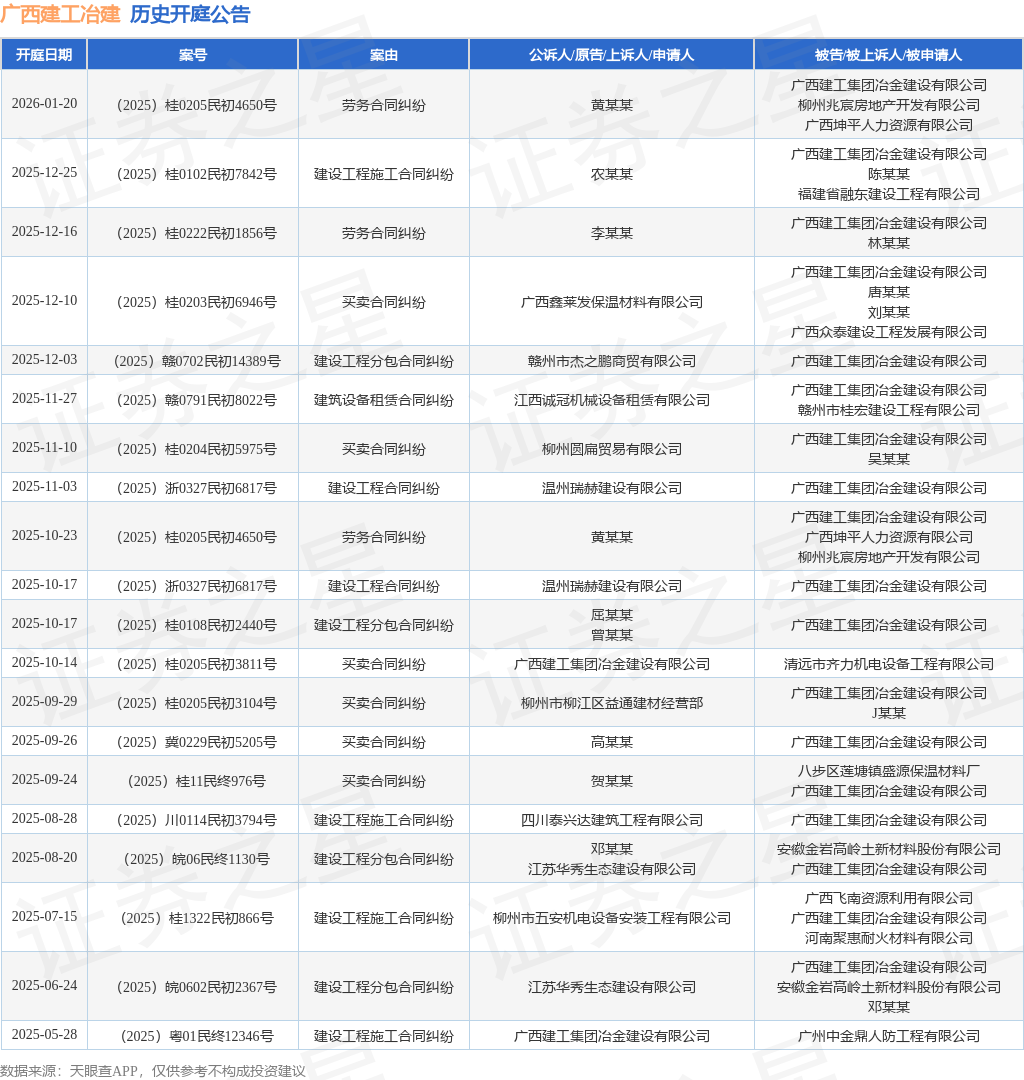 案号:(2025)桂0102民初7842号根据统计,近一年内以广西建工集团冶金建设有限公司为当事人的历史开庭公告有40则,其中案由为“买卖合同纠纷”的公告以11则居首,其次为“建设工程施工合同纠纷”有7则,“劳务合同纠纷”有6则。历史开庭公告(前20条)如下: