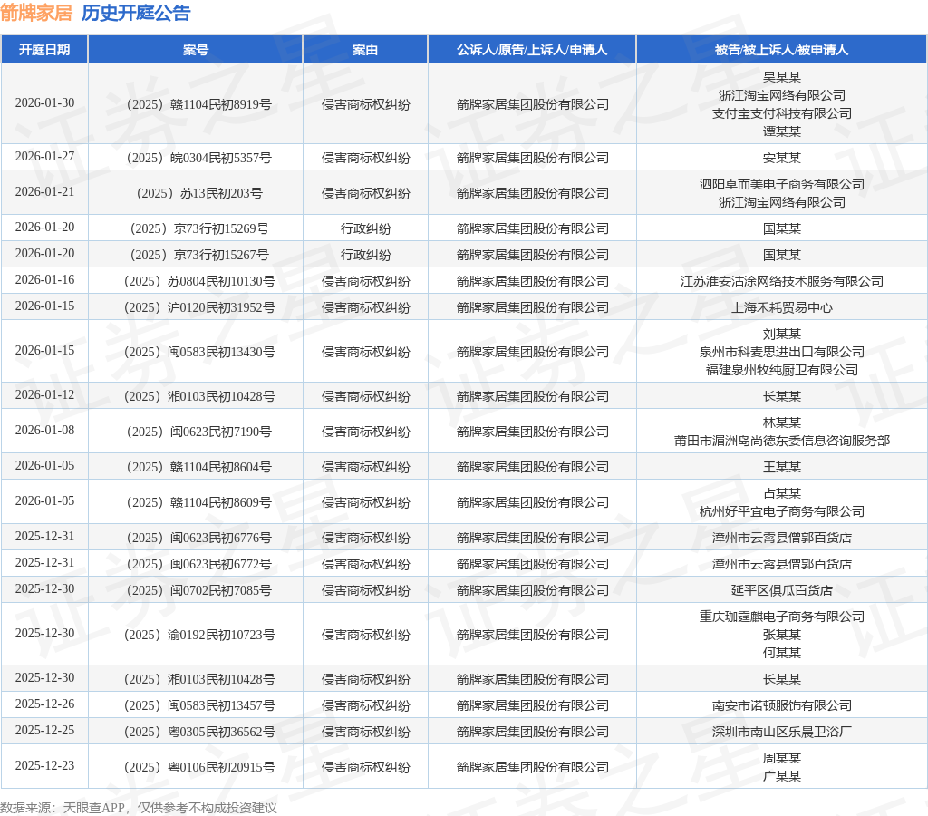 案号:(2025)粤0305民初36562号根据统计,近一年内以箭牌家居集团股份有限公司为当事人的历史开庭公告有474则,其中案由为“侵害商标权纠纷”的公告以416则居首,其次为“商标权权属、侵权纠纷”有16则,“行政纠纷”有8则。历史开庭公告(前20条)如下:
