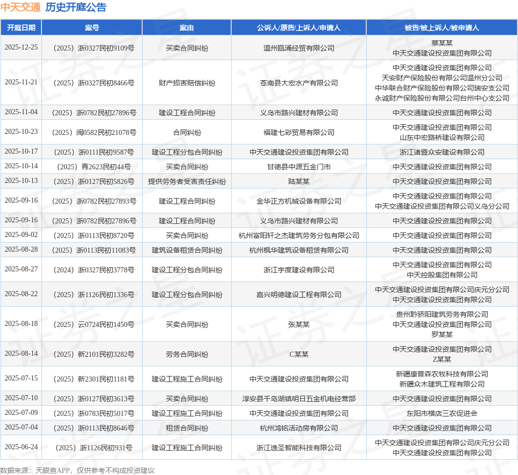 案号:(2025)浙0327民初9109号根据统计,近一年内以中天交通建设投资集团有限公司为当事人的历史开庭公告有36则,其中案由为“买卖合同纠纷”的公告以10则居首,其次为“建设工程施工合同纠纷”有7则,“建设工程分包合同纠纷”有4则。历史开庭公告(前20条)如下:
