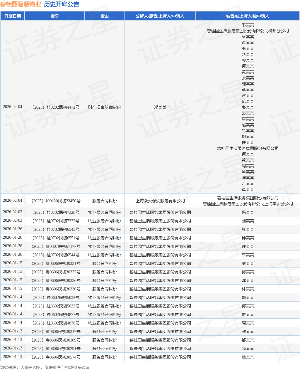 案号:(2025)闽0581民初10530号根据统计,近一年内以碧桂园生活服务集团股份有限公司为当事人的历史开庭公告有42则,其中案由为“物业服务合同纠纷”的公告以22则居首,其次为“服务合同纠纷”有14则,“合同纠纷”有2则。历史开庭公告(前20条)如下: