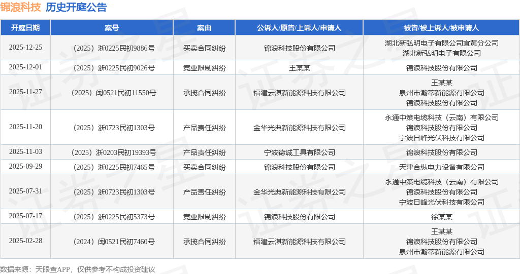 根据统计,近一年内以锦浪科技股份有限公司为当事人的历史开庭公告有9则,其中案由为“产品责任纠纷”的公告以3则居首,其次为“买卖合同纠纷”有2则,“承揽合同纠纷”有2则。历史开庭公告如下: