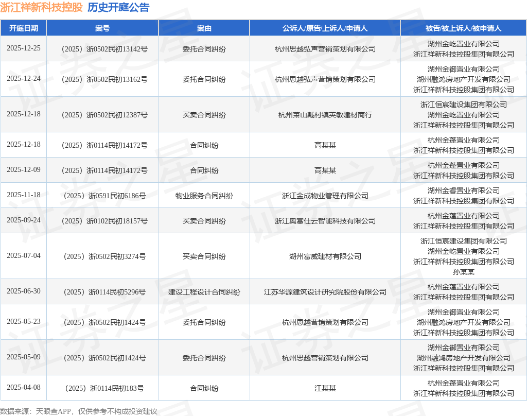案号:(2025)浙0502民初13142号根据统计,近一年内以浙江祥新科技控股集团有限公司为当事人的历史开庭公告有12则,其中案由为“委托合同纠纷”的公告以4则居首,其次为“买卖合同纠纷”有3则,“合同纠纷”有3则。历史开庭公告如下: