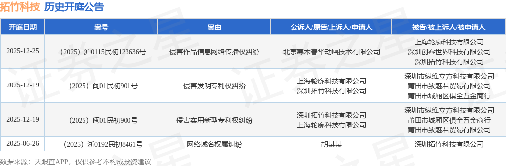 案号:(2025)沪0115民初123636号根据统计,近一年内以深圳拓竹科技有限公司为当事人的历史开庭公告有4则,其中案由为“侵害作品信息网络传播权纠纷”的公告以1则居首,其次为“侵害发明专利权纠纷”有1则,“侵害实用新型专利权纠纷”有1则。历史开庭公告如下: